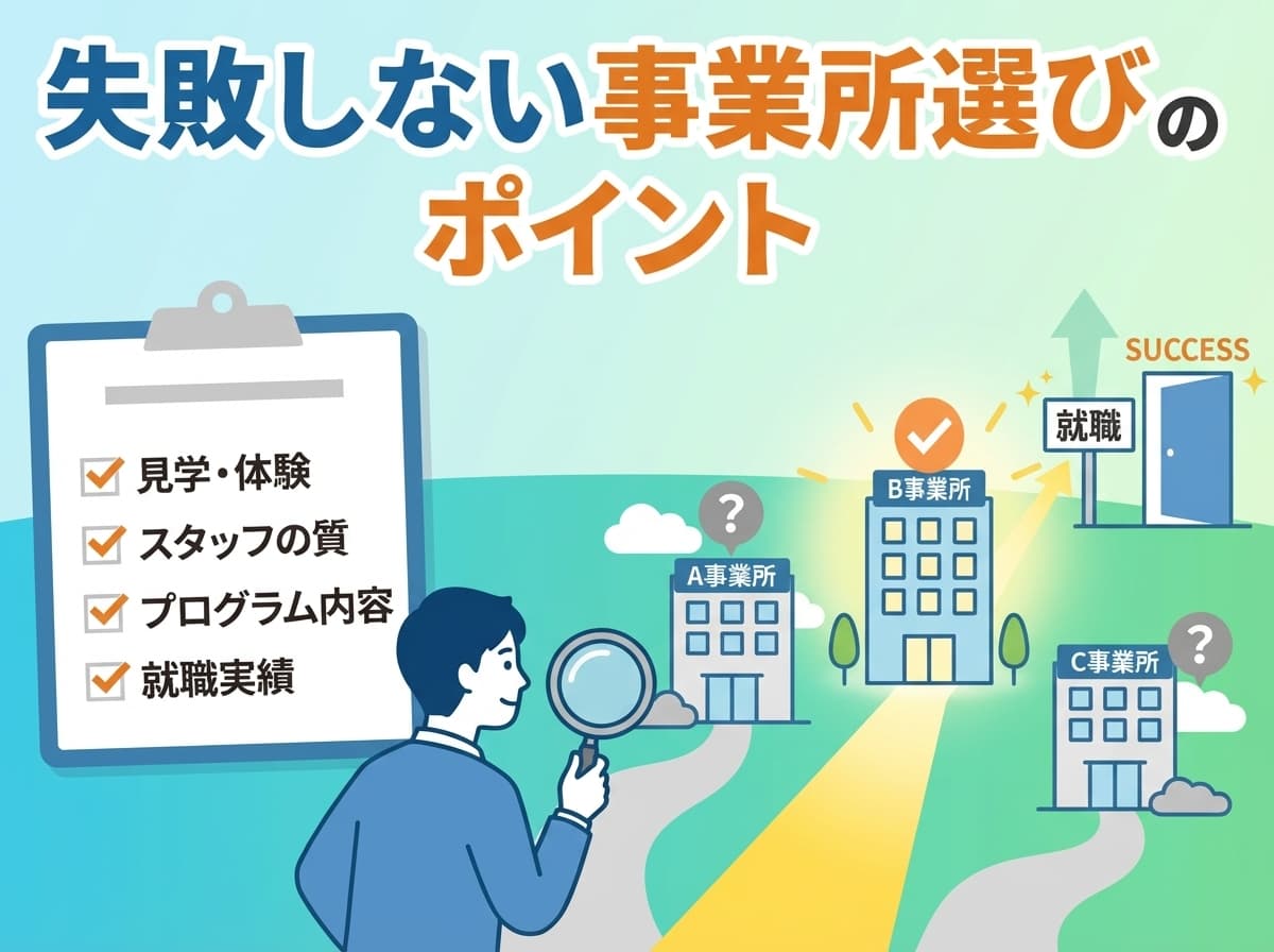 事業所選びにおいて訓練の内容も大切ですが、スタッフとの話しやすさ、通いやすさもしっかりと検討することで失敗リスクを減らせます。